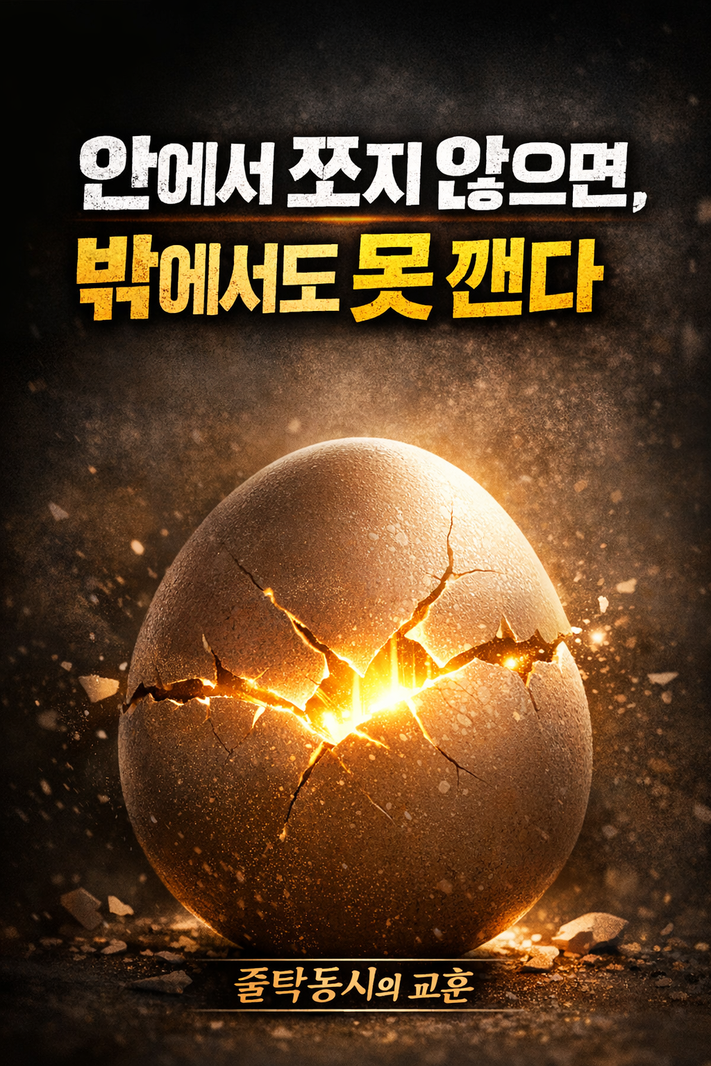 줄탁동시는 노력 + 도움 + 타이밍, 이 세가지가 맞아떨어질 때 비로소 성장이 일어난다는 뜻입니다.