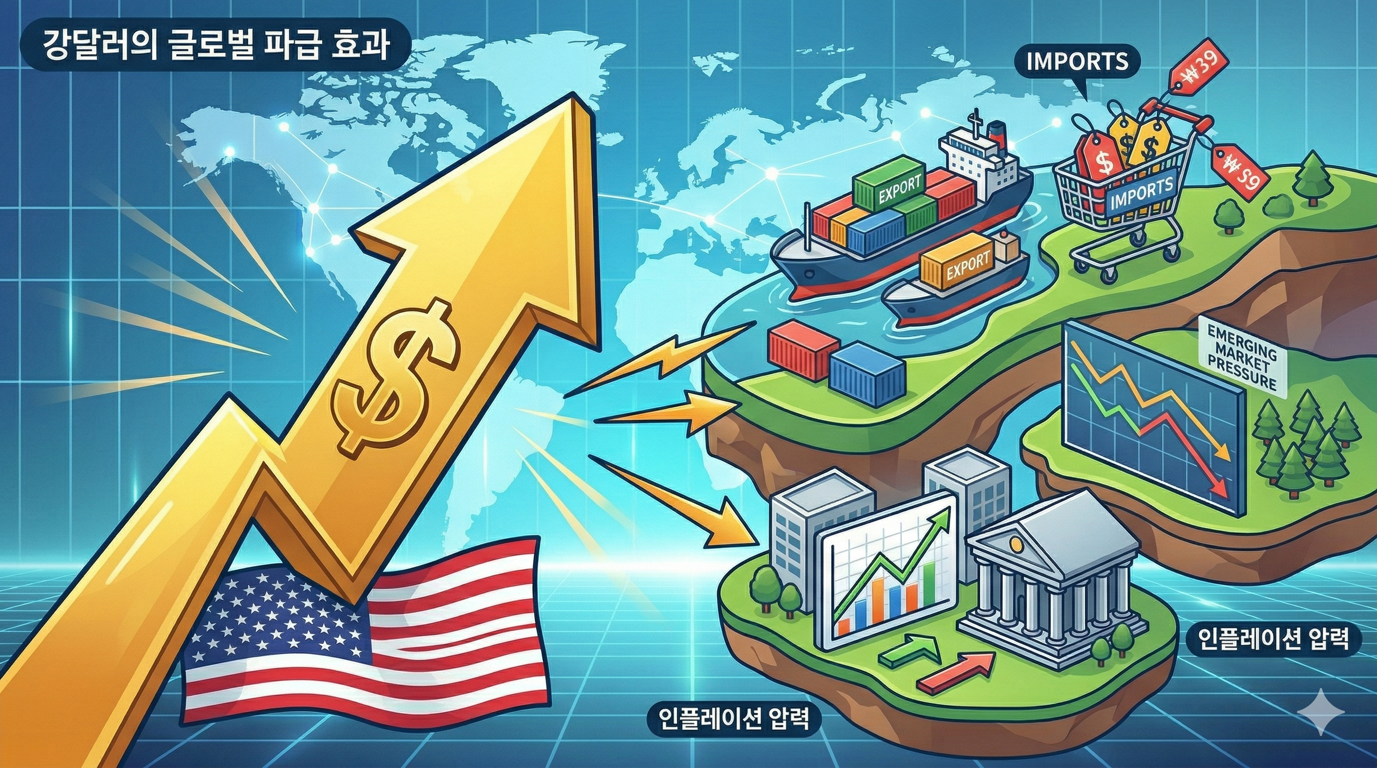 또한 전 세계적으로 원자재 가격(원유, 금 등)은 주로 달러로 결제되기 때문에 달러 가치가 상승하면 원자재 가격이 비싸지는 효과가 발생합니다.(인플레이션 압력) 한국과 같은 신흥국은 수입 물가 상승과 자본 유출 우려를 겪을 수 있습니다.