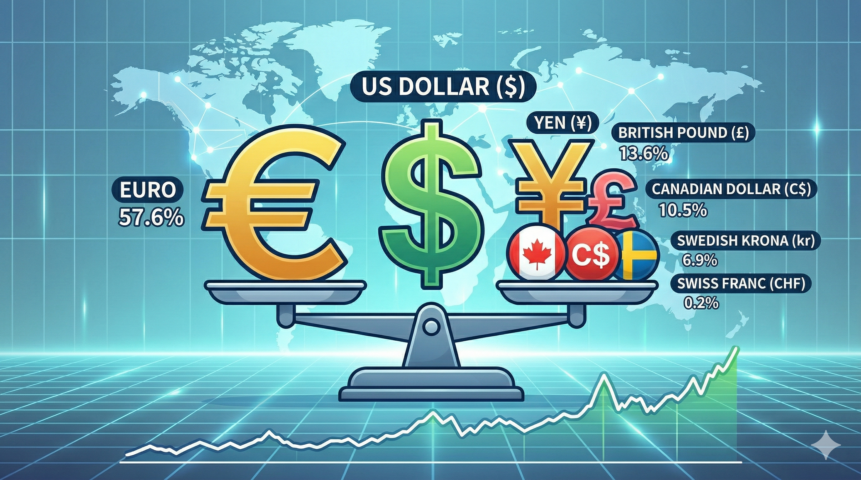 이 지표를 구성하는 주요 6개 통화는 유로(EUR), 일본 엔(JPY), 영국 파운드(GBP), 캐나다 달러(CAD), 스웨덴 크로나(SEK), 스위스 프랑(CHF) 입니다. 각 통화의 경제 규모와 거래량을 고려하여 가중치를 다르게 부여합니다.